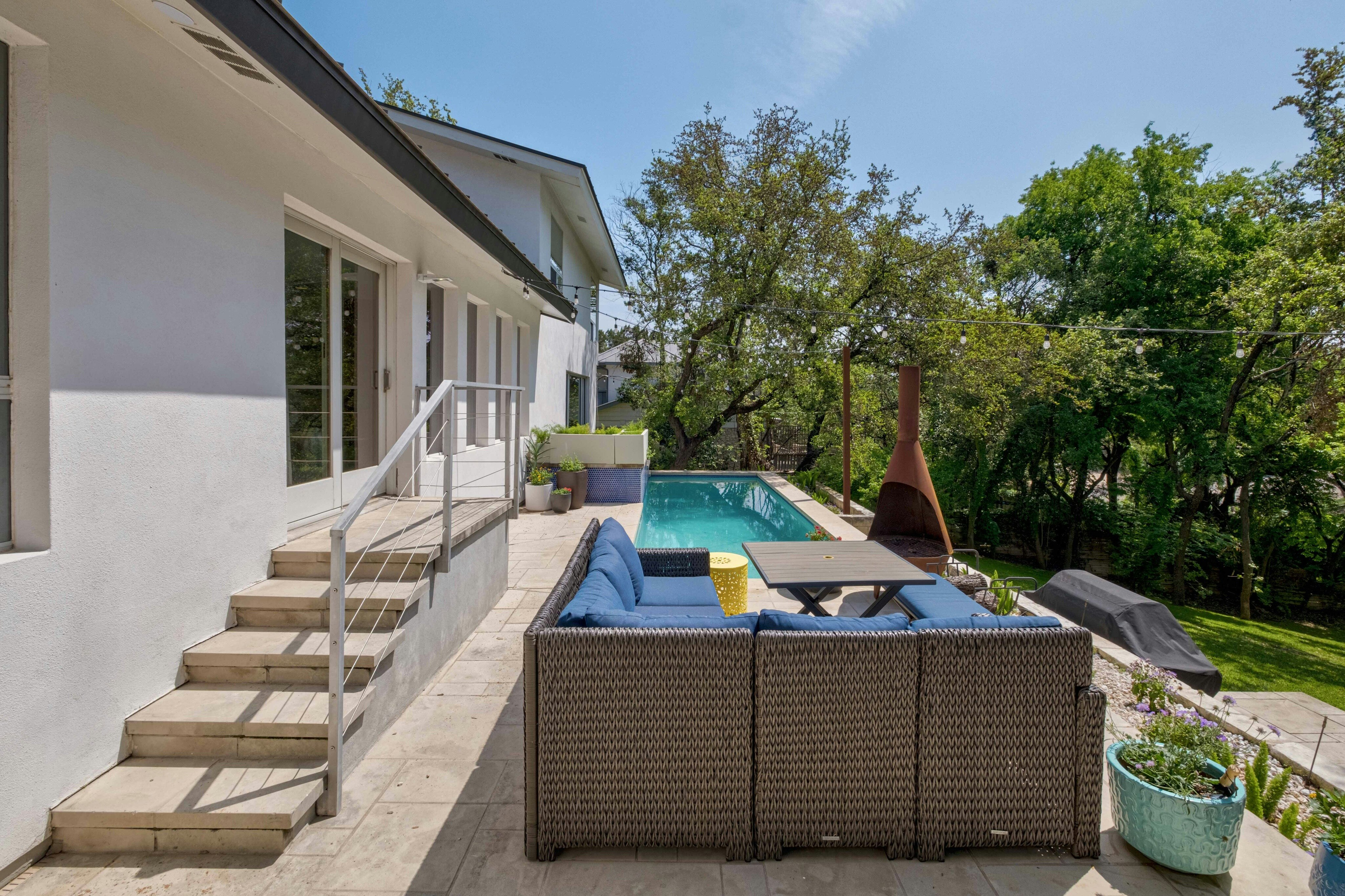 This Westwood stunner showcases a sophisticated addition and remodel by architect Erik Gonzalez of Sago International. The 4 bedroom, 3.5 bath residence includes a dedicated office, formal living, expansive dining area, and a spacious great room highlighted by a dramatic wall of glass overlooking the park-like 0.41-acre yard and pool. The primary suite is located on the main level with three additional bedrooms and two bathrooms upstairs. Ideally situated with easy access to downtown Austin, Zilker Park, shopping, and dining. Convenient to H-E-B, Trader Joe’s, Swedish Hill, Texas Honey Ham, and more. Zoned to top-rated Eanes ISD schools: Eanes Elementary, Hill Country Middle, and Westlake High.